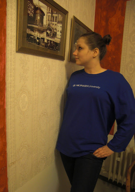 Ach der Montag ist immer der Anfang einer langen Arbeitswoche und ich bin immer traurig, dass das Wochenende schon vorbei ist. Na ja... da sehnt man sich doch nach den alten guten Studi-Zeiten zurück, auch wenn die Klausuren manchmal nervig waren. Vorletztes Wochenende hat mir mein Freund seinen Uni-Pullover geliehen. Und da dieser so schön kuschelig groß war und ich das blau total mag, habe ich ihn gleich mal mitgenommen :) So und dies war mein heutiges Outfit und jetzt wird erstmal schön gechillt, Beine hoch und Faulenzen...