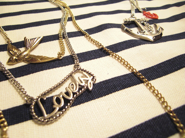 Hi meine Lieben, JA ENDLICH habe ich eine Anker-Kette gefunden! Das wurde auch echt Zeit!!!! Hab immer mal wieder danach Ausschau und gehalten und heute wurde ich fundig. Wo sonst wenn nicht bei H&M?! Und wenn man schon mal da ist, kann man auch gleich weiter schauen ;) Habe mir dann noch eine weitere Kette gekauft, na ja eigentlich 3. Denn die Kette besteht aus 3 Ketten, 2 goldene und eine siberne. Die eine goldene hat eine Schwalbe integriert und die andere einen aufklappbaren Apfel. Die silberne Kette "sagt" Lovely. Hängt man alle drei um, sind sie stufig angeordnet aber man kann auch nur eine oder zwei kombinieren. Das mag ich. Zu guter Letzt noch nen einfachen, aber blau gestreiften Stoffbeutel aus der Organic Cotton Linie. Das wars :)