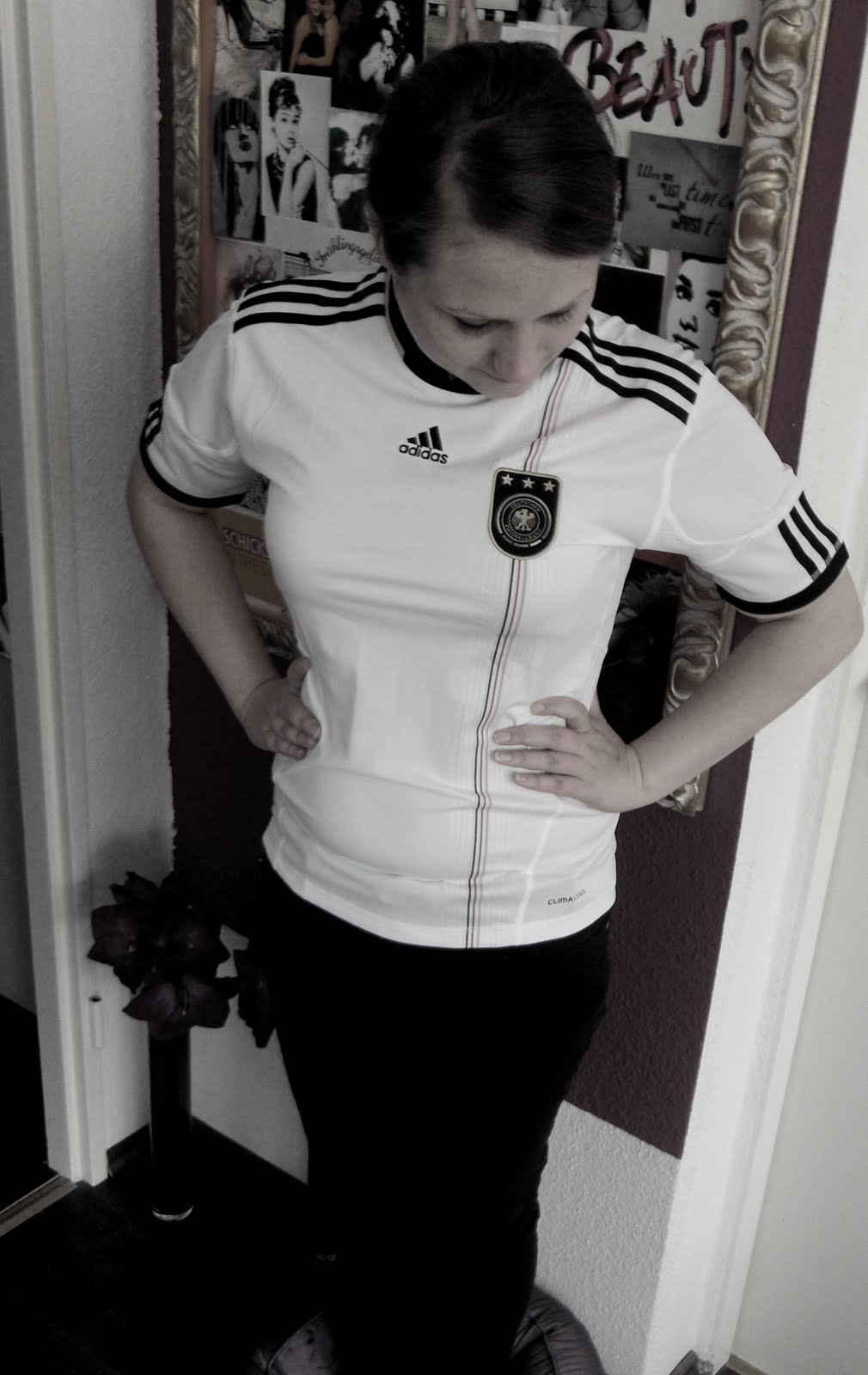 Ladies and Gentlemen, der Countdown läuft und bald hört man das Gegröle aus allen Ecken wieder, "Deutschlaaaand, Deutschlaaaaaaaand". Ich selbst, bin jetzt nicht der größte Fußball-Fan aber wenn es um die EM oder WM geht, fieber ich für unsere Jungs schon mit. Fanmeile, Public Viewing oder kleine Fußball-Partys mit Freunden, die Stimmung rockt und es macht einfach Spaß - solange wir gewinnen :). Und was wäre da nicht passender, als das perfekte WM-Fußball-Outfit?! Genau, wir sind halt immernoch Frauen und wer sagt denn, wir können nicht Abseits erklären und trotzdem dabei fabelhaft aussehen?! Gestern, bekam ich ein Paket mit dem neuem Trikot geliefert, welches mein Freund (GRÖßTER FUßBALL FAN EVER) mir als Überraschung bestellt hatte. Witzigerweise bin ich zuvor bei New Yorker durch Zufall auf die World Cup Edition aufmerksam geworden. Ein Fußball-Tuch und 3 Pins landeten dabei in meiner Tasche. Wir wollen es ja nicht übertreiben, gell?! :)