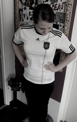 Ladies and Gentlemen, the countdown for the World Cup is already going on and soon you'll hear the fans screaming and singing for their favorite teams. I myself am not the biggest fan of soccer but when it comes to both the European and World Cup, I cross my fingers for our team. Fan Fest, Public Viewing or private soccer parties with friends, it's just soooo much fun and the atmosphere rocks - as long as we are winning :). But let's get serious now: We are women and we need the perfect soccer-matching-outfit, don't we? Right, who says women cannot explain "Offside" and look fabulous at the same time? Yesterday a package with the new jersey arrived which my boyfriend (BIGGEST SOCCER FAN EVER) ordered for me as a surprise. Before that I discovered the World Cup Edition at New Yorker and bought a scarf and three pins. Now I am ready for the World Cup.